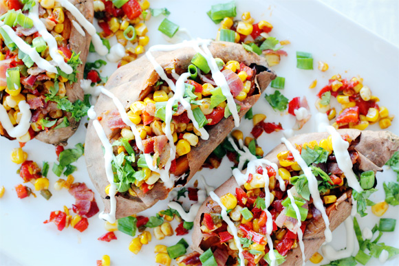 Fresh Corn and Bacon Hash Stuffed Sweet Potatoes with Lime Crema